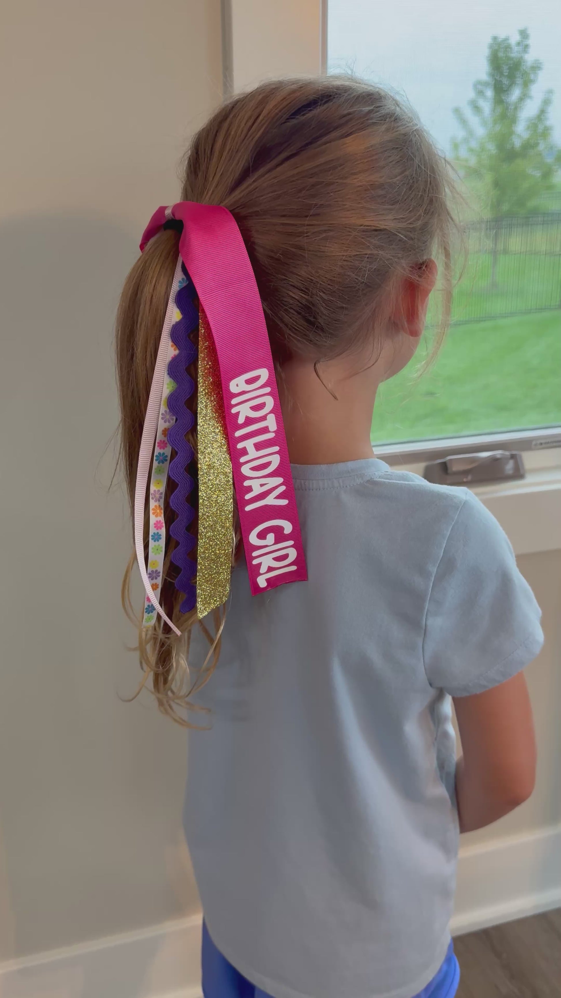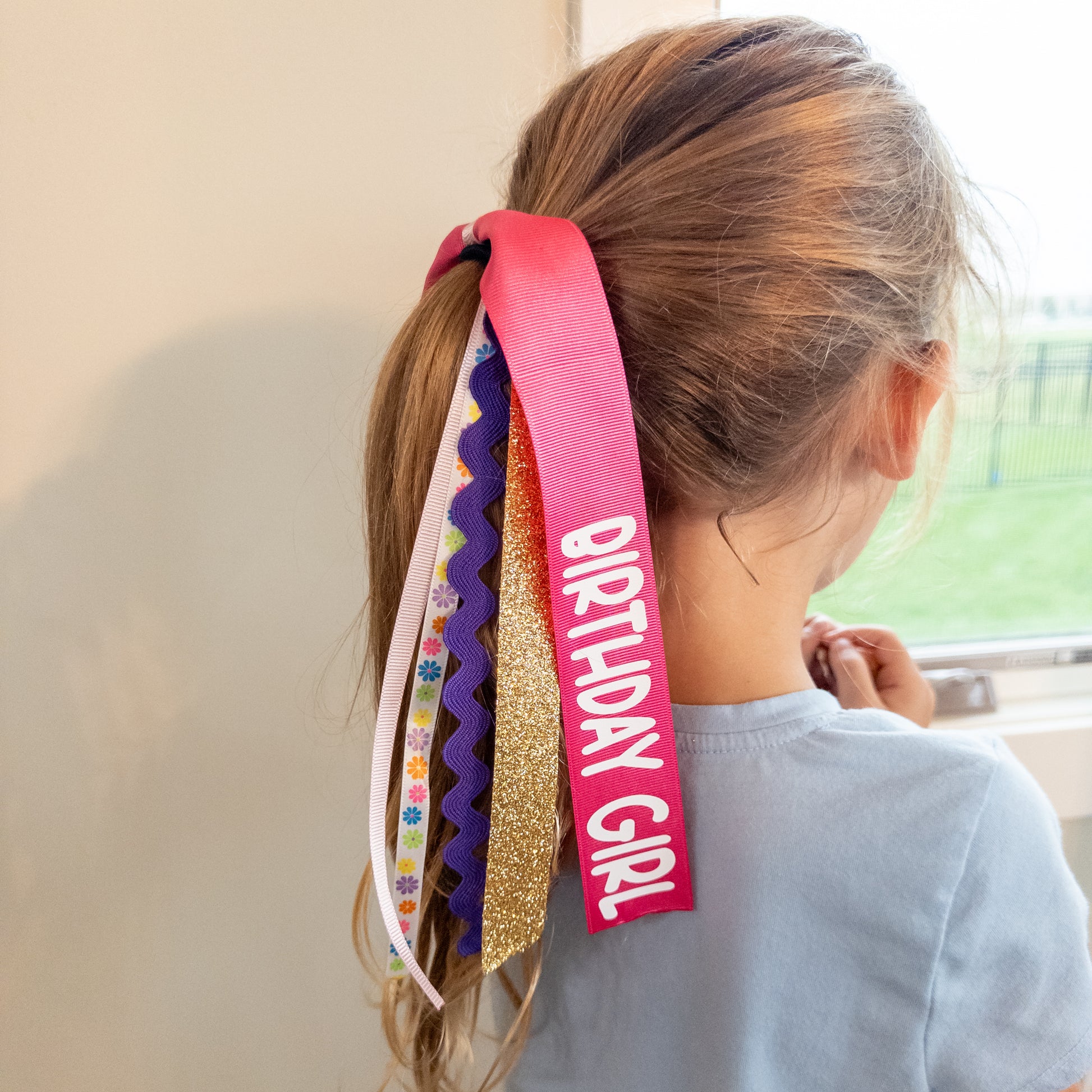 Each streamer is handmade with five coordinating ribbons in the birthday girl’s favorite colors, then finished with “Birthday Girl” in iron-on lettering. It’s lightweight, easy to tie around any ponytail, and adds the perfect touch of celebration to party outfits, photo ops, and cake time!