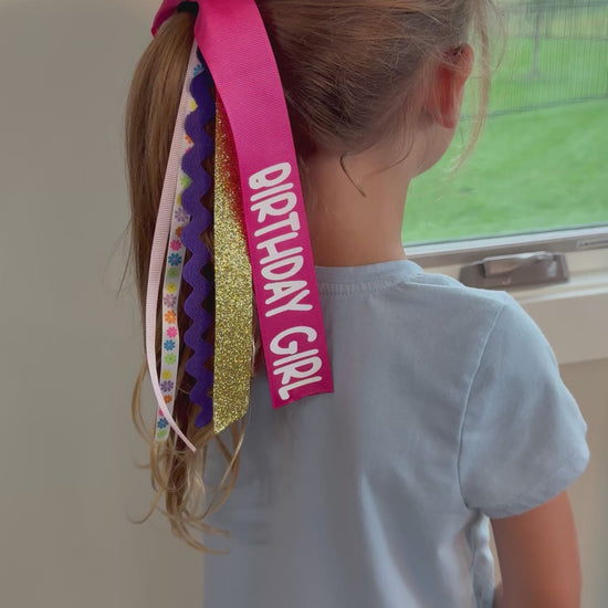 Make your little one’s special day extra festive with our custom Birthday Girl Ponytail Streamer! This fun and colorful hair accessory is the perfect way for the birthday girl to stand out and shine.