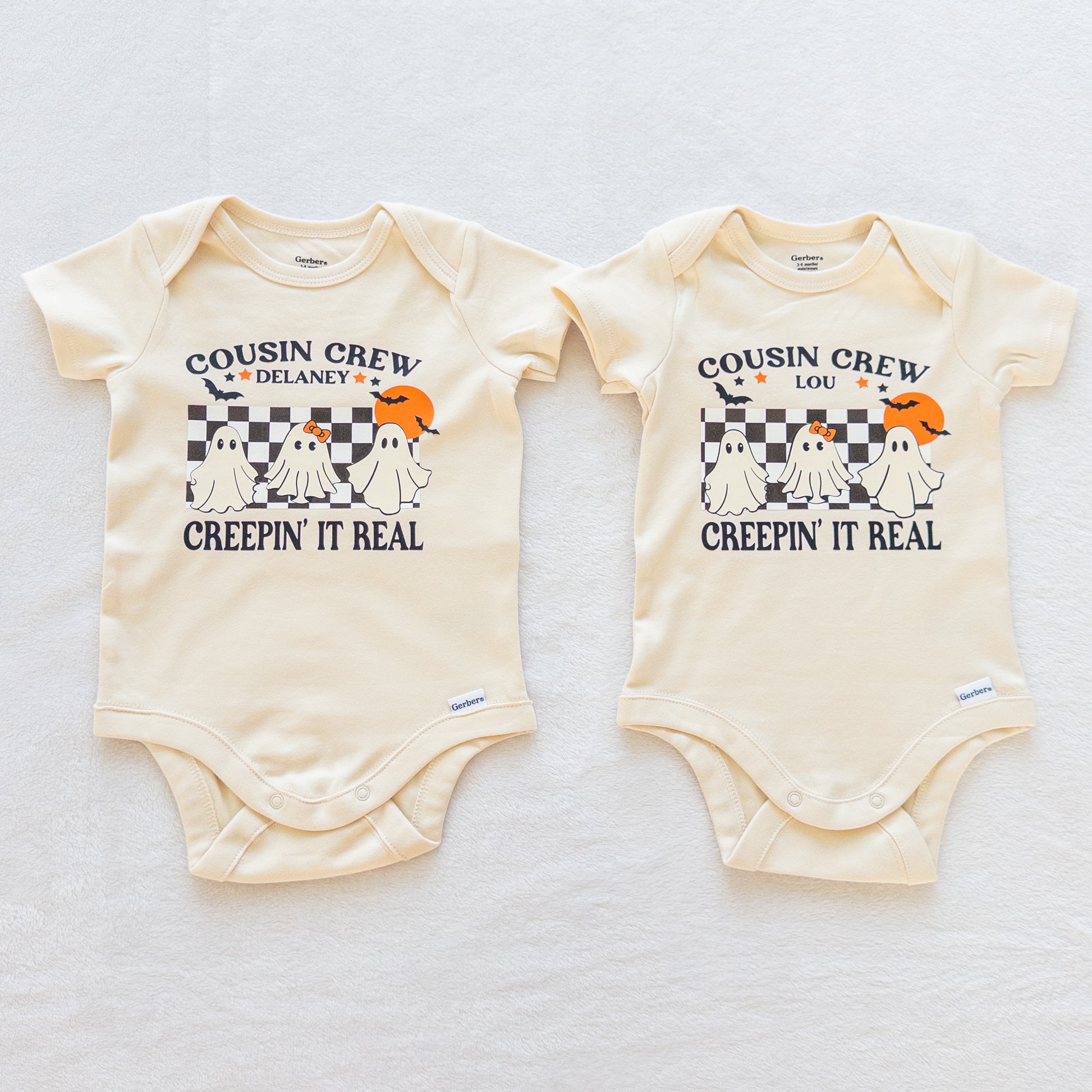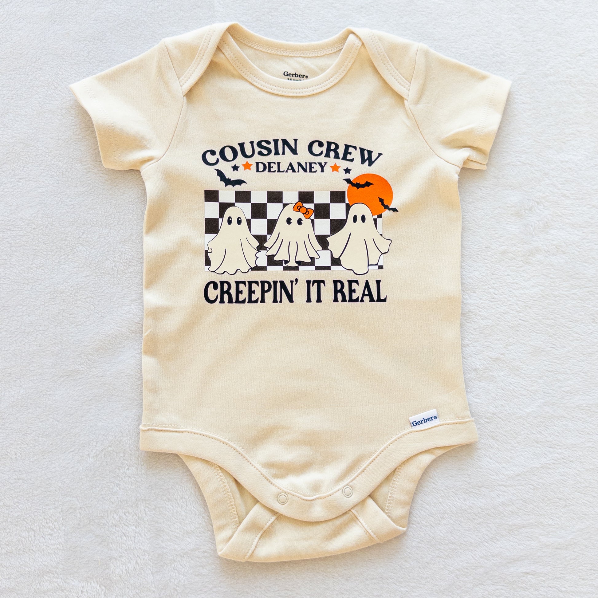 Your little one will be the cutest ghost on the block in this retro-inspired Halloween onesie! Featuring three adorable ghosts, festive pumpkins, and a trendy checkered background, this design is perfect for spooky season. The playful phrase “Creepin’ It Real” adds a fun touch, while the custom name makes it uniquely theirs.