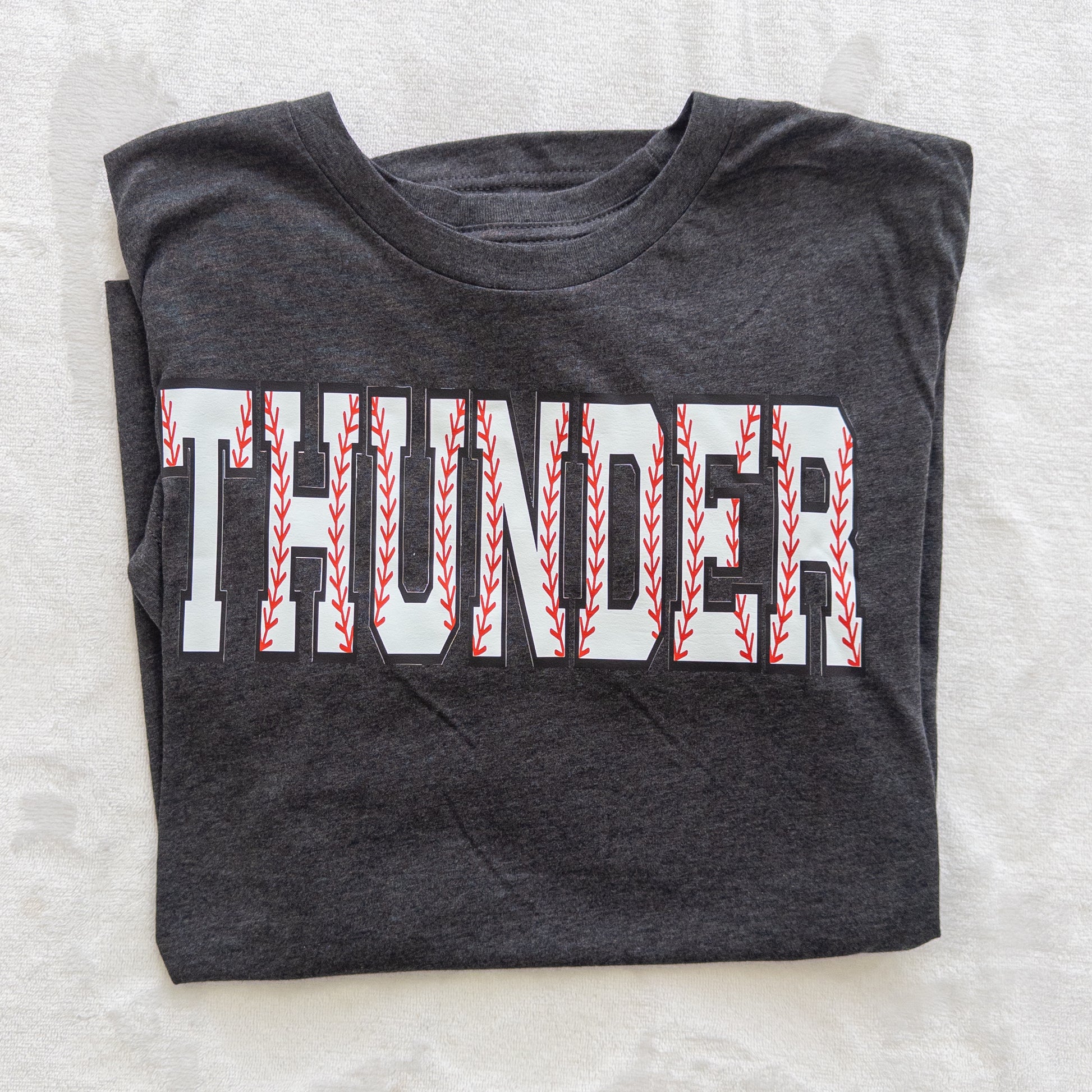 Step up to the plate in a shirt made just for your team! This custom baseball shirt features bold varsity-style lettering filled with classic baseball stitching, giving it the perfect sporty look for game days, practices, and cheering from the stands.