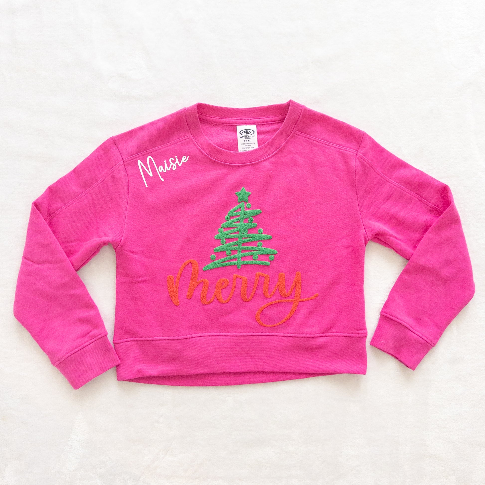 Personalized Christmas Sweatshirt – Pink “Merry” Tree Design