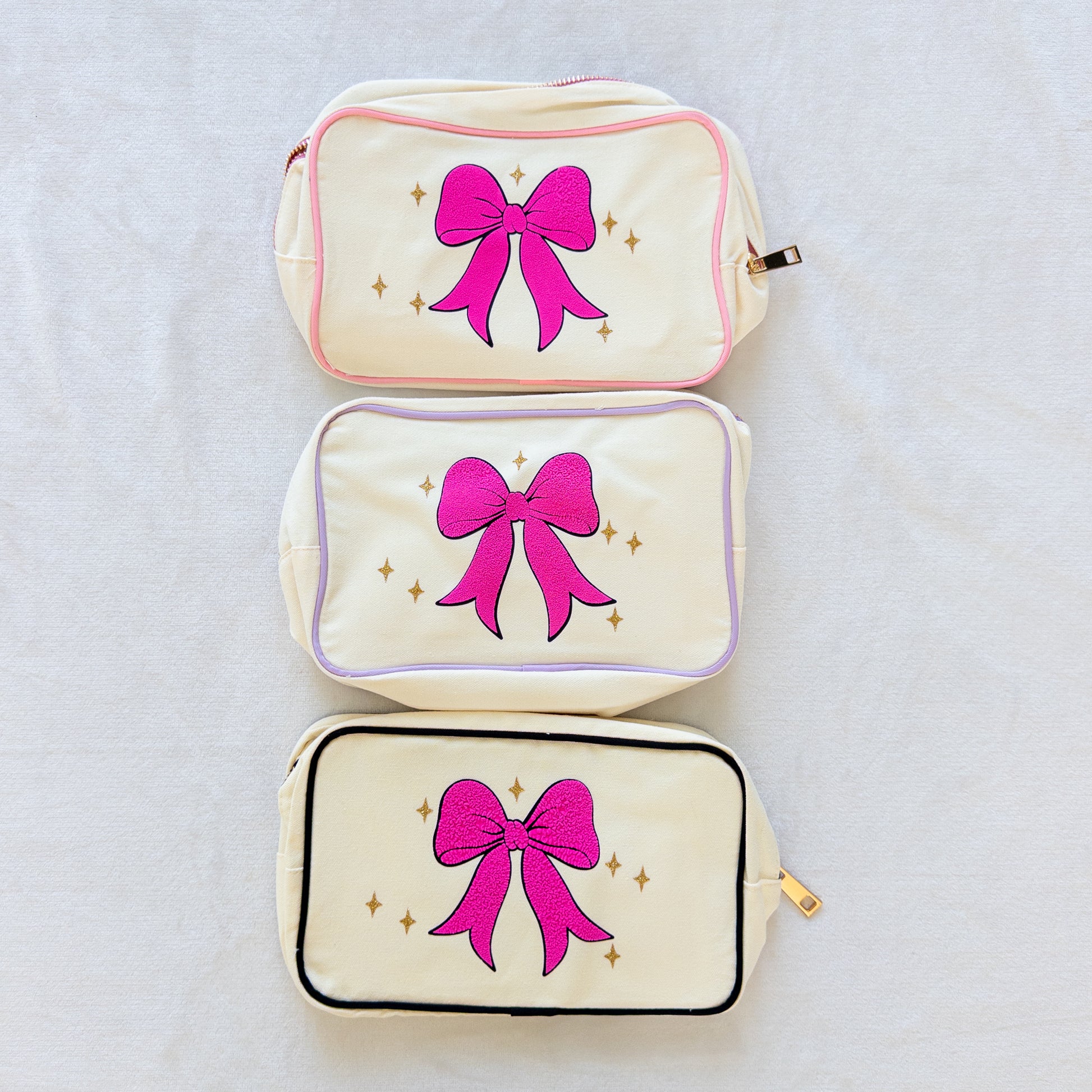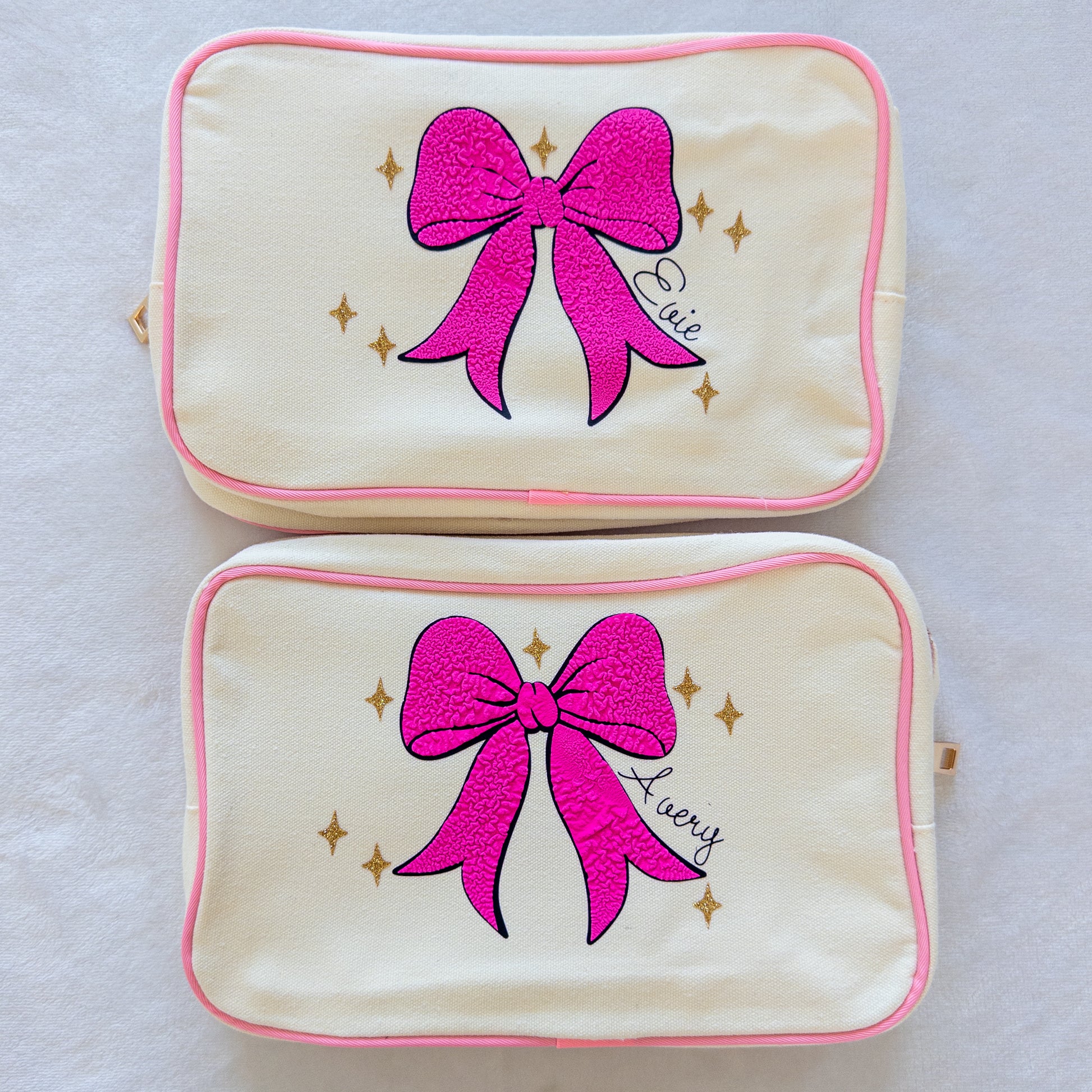 Add a little sparkle to your gift-giving (or everyday routine) with our Personalized Pink Bow Canvas Bag! Each bag features a soft, textured pink bow with glittery stars that shimmer beautifully in the light. The front is personalized with a name in elegant cursive lettering—making it truly one-of-a-kind.