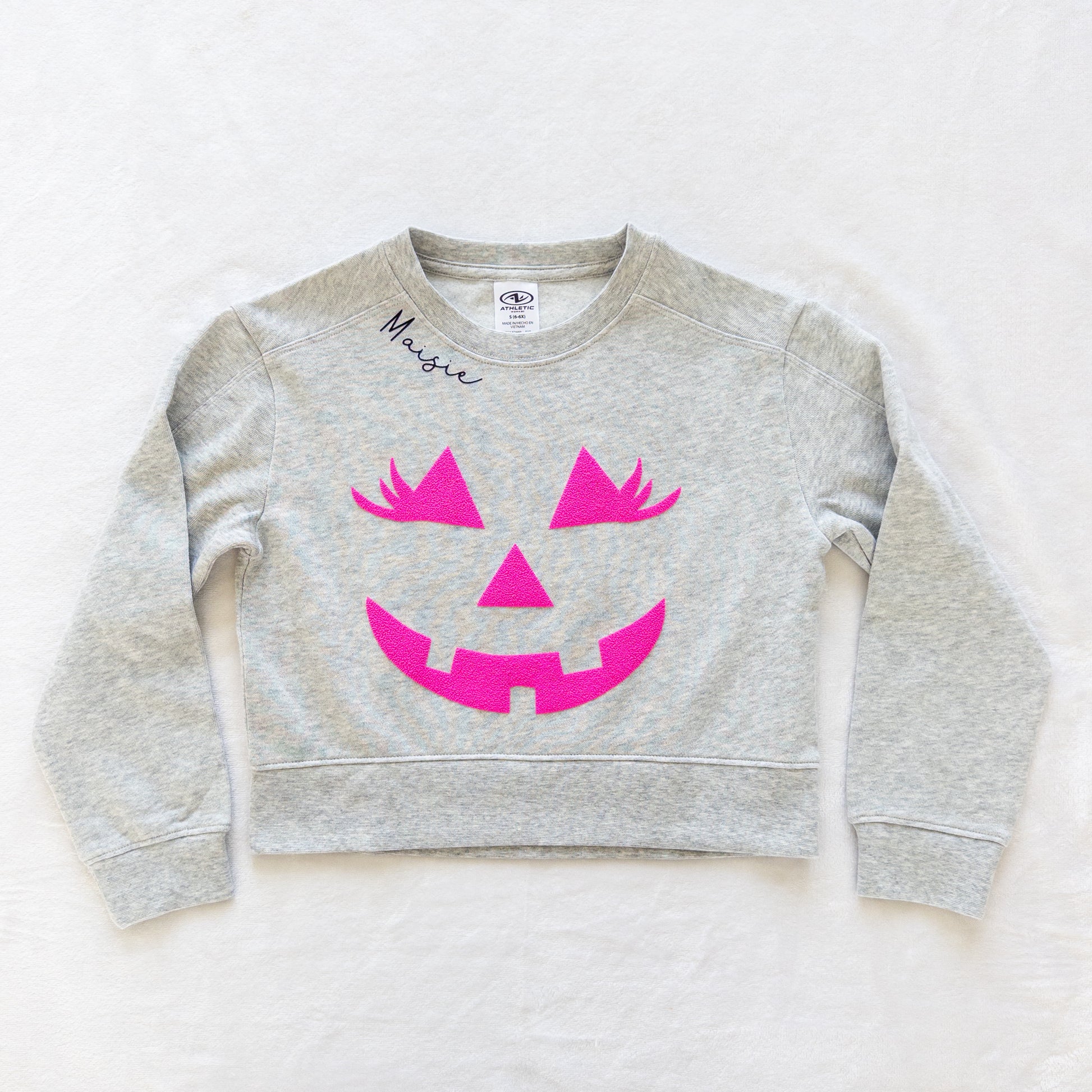 Make spooky season extra special with this adorable personalized Halloween sweatshirt! Each sweatshirt features a playful jack-o’-lantern face made with high-quality puff vinyl for a fun, textured look. To make it truly unique, your child’s name is added on the top right collarbone—a sweet detail that sets this piece apart.